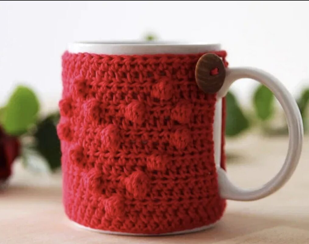Leuke patronen: Organizer Mug Cozy van Sweet Potato 3, Lavender Farmhouse Cup Cozy van The Ginger Hooker, Bean stitch coffee cup cozy van Alexis Cole of I Heart U Mug Cozy van Kirsten Ballering.