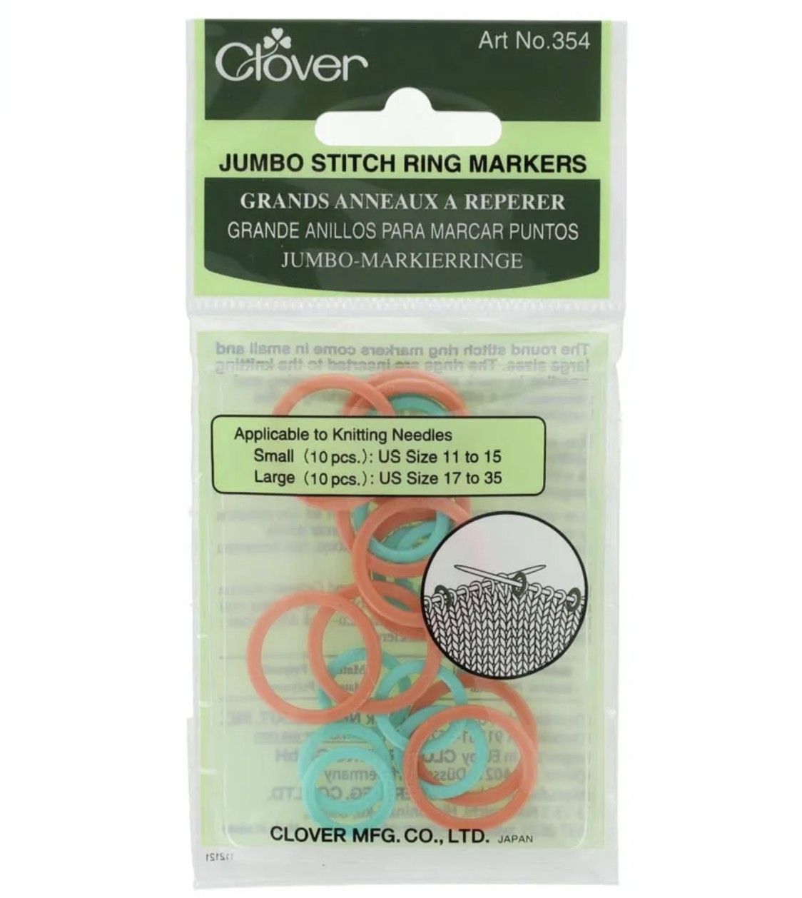 Deze jumbo markeerringen zijn gemaakt van stevige kunststof en komen in frisse tinten oranje en mintgroen. De kleine ringen passen op naalddikte 8.00–10.00 mm, terwijl de grote geschikt zijn voor 12.75–19.00 mm. In elke verpakking zitten 20 stekenmarkeerders: 10 kleine en 10 grote.